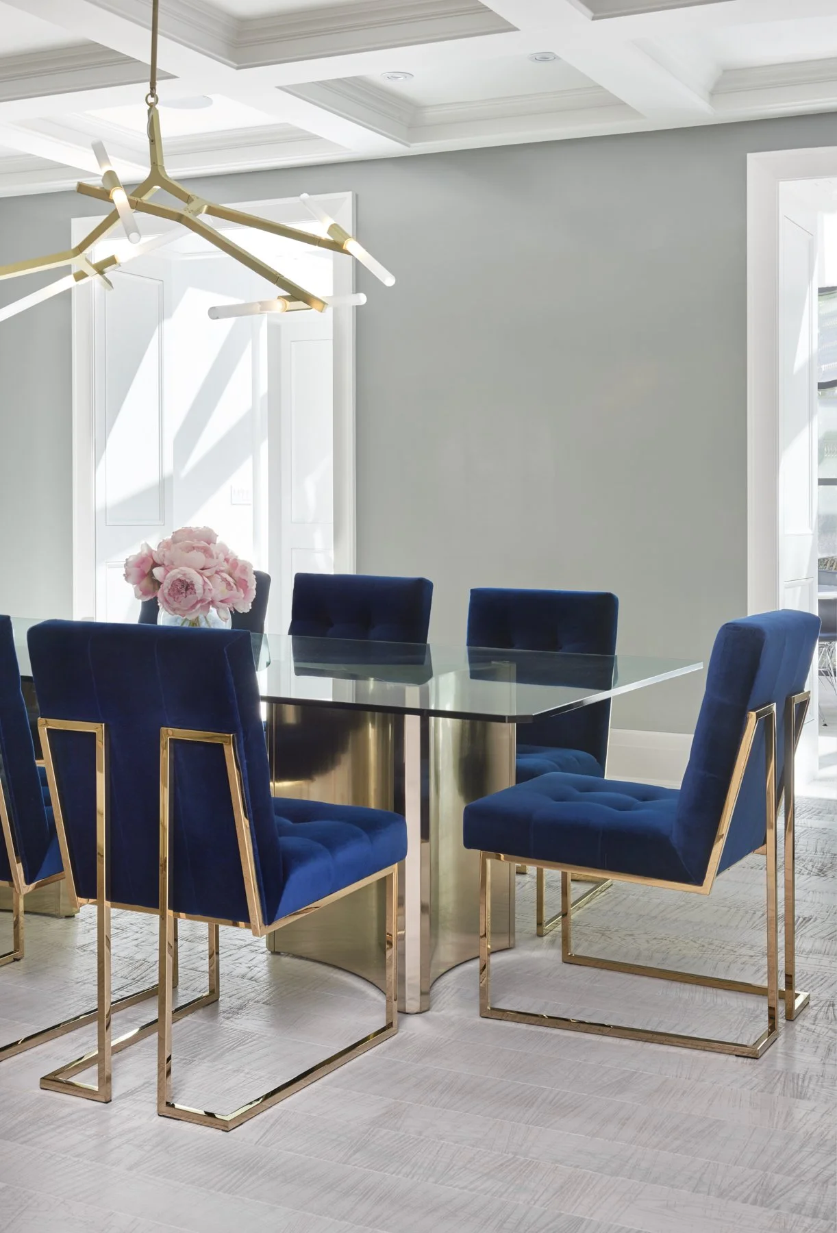 Modern dining room with blue velvet chairs, a glass-top table, gold accents, and a geometric chandelier. A vase with pink flowers sits on the table.